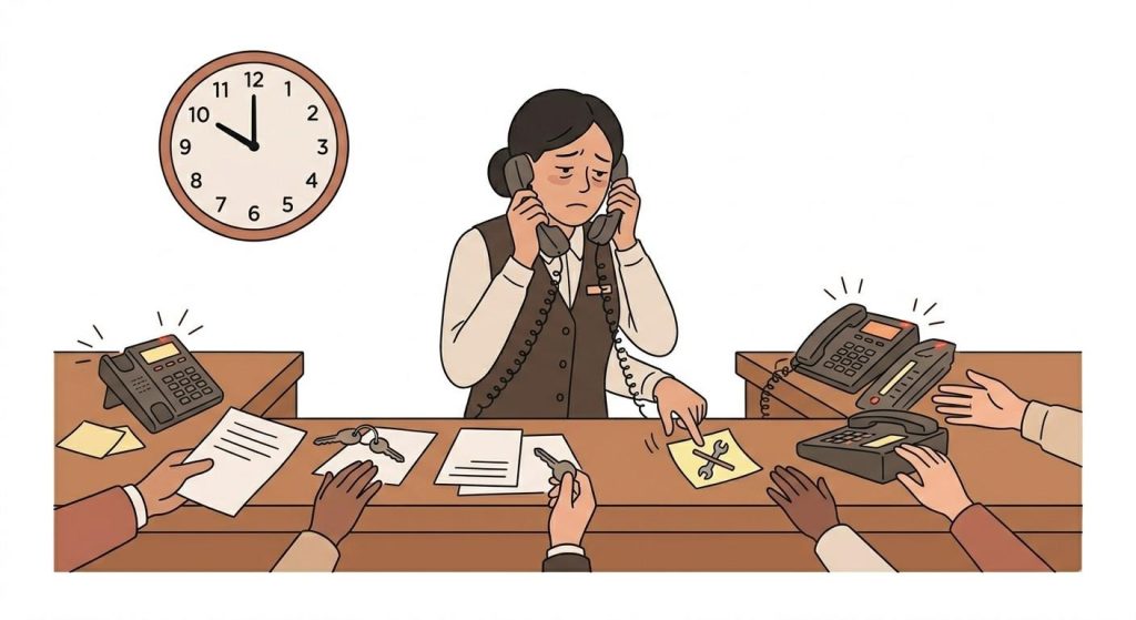Picture this. It is a Friday night. The hotel is 90% full. A guest in room 412 calls the front desk at 11 PM. The AC is broken, and the room feels like a greenhouse. The front desk agent, managing two other calls and a queue of late check-ins, logs the complaint on a sticky note, promises someone will come by, and gets back to the chaos.