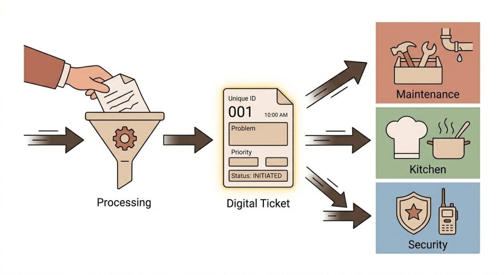 A maintenance complaint goes directly to maintenance. A food complaint goes to the kitchen. A noise complaint goes to security. No one has to read it, decide who handles it, and then make a phone call to pass it along. That whole chain, which used to take minutes or sometimes hours, now takes seconds.