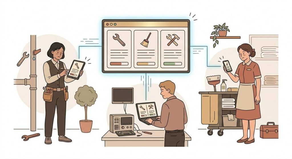 Now run the same scenario through an automated system. One complaint creates three tasks, each assigned to the right department, each visible in a single dashboard. Maintenance sees their job. The technology team sees theirs. Housekeeping sees theirs.